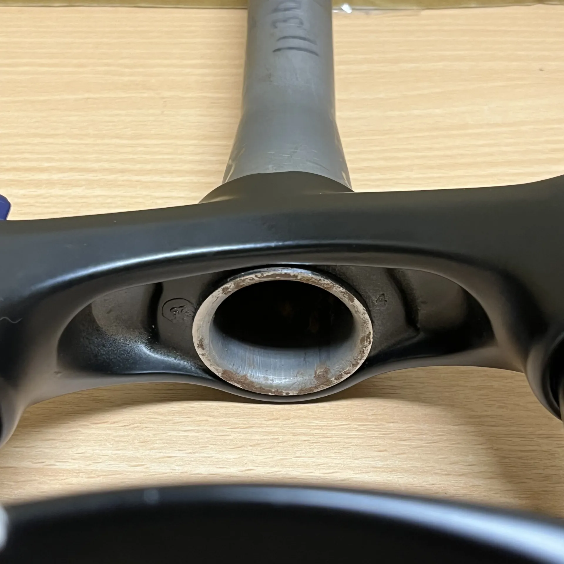 This particular unit has been previously fitted to a bike and ridden only 4–5 times. It shows minor cosmetic wear, including small rust spots near the bottom of the steerer tube and missing rubber plugs on the back of the lowers, but remains structurally sound and in good working order.