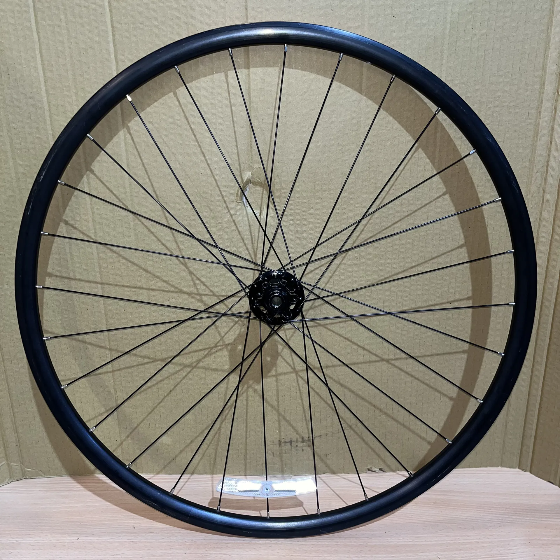 OEM 700c road front wheel with 100x12mm thru axle and 6 bolt disc mount. 28 spokes, sealed bearings and 21mm external rim width. Unridden with storage marks.